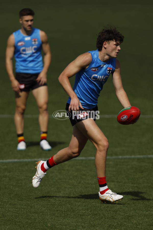 MELBOURNE, AUSTRALIA - MARCH 13: Oscar Adams of the Saints runs with the ball during a St Kilda Saints AFL training session at RSEA Park on March 13, 2023 in Melbourne, Australia. (Photo by Darrian Traynor/Getty Images via AFL Photos)