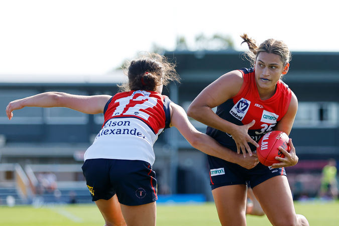 MELBOURNE, AUSTRALIA - APRIL 02: Eliza West of the Demons is tackled by Rebecca Goring of the Falcons during the 2023 VFLW Round 02 match between the Casey Demons and the Darebin Falcons at Casey Fields on April 2, 2023 in Melbourne, Australia. (Photo by Dylan Burns/AFL Photos)