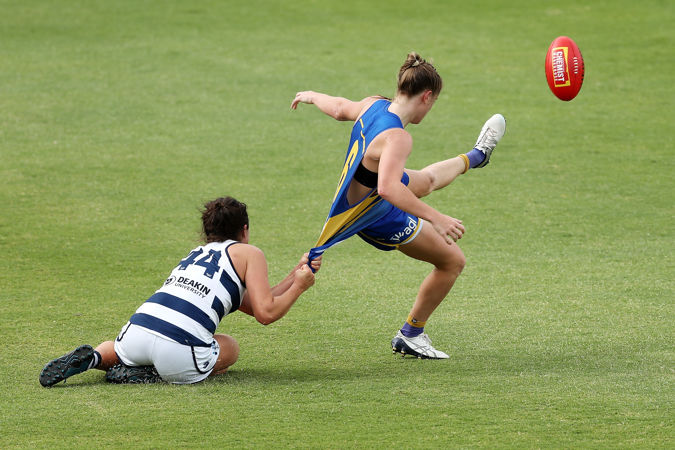 PERTH, AUSTRALIA - MARCH 15: Isabella Lewis of the Eagles tries to shake off Rebecca Goring of the Cats during the 2021 AFLW Round 07 match between the West Coast Eagles and the Geelong Cats at Mineral Resources Park on March 15, 2021 in Perth, Australia. (Photo by Will Russell/AFL Photos)