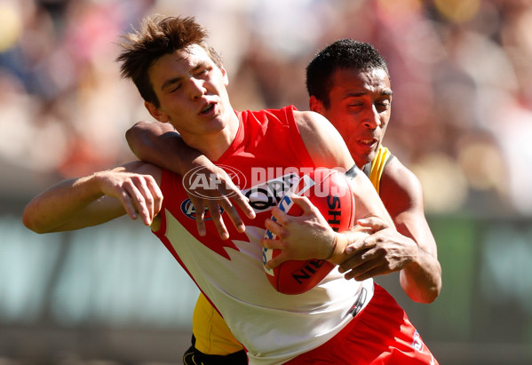 MELBOURNE, AUSTRALIA - APRIL 03: Errol Gulden of the Swans is taken high by Derek Eggmolesse-Smith of the Tigers during the 2021 AFL Round 03 match between the Richmond Tigers and the Sydney Swans at the Melbourne Cricket Ground on April 03, 2021 in Melbourne, Australia. (Photo by Michael Willson/AFL Photos)