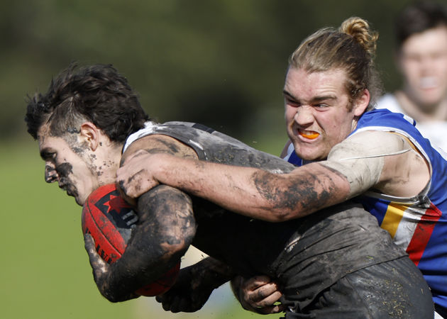 MELBOURNE, AUSTRALIA - JUNE 18: Ben Ham of the Knights is tackled by Callum Verrell of the Ranges during the NAB League Boys match between Northern Knights v Eastern Ranges at Preston City Oval on June 18, 2022 in Melbourne, Australia. (Photo by Jonathan DiMaggio/AFL Photos)