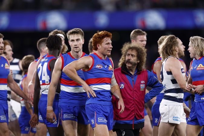 MELBOURNE, AUSTRALIA - JUNE 03: Western Bulldogs club doctor Dr. Gary Zimmerman checks on Ed Richards of the Bulldogs at 3/4 time during the round 12 AFL match between the Western Bulldogs and the Geelong Cats at Marvel Stadium on June 03, 2022 in Melbourne, Australia. (Photo by Darrian Traynor/Getty Images via AFL Photos)