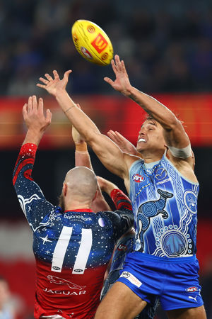 MELBOURNE, AUSTRALIA - MAY 21: Kyron Hayden of the Kangaroos (R) competes for the ball during the round 10 AFL match between the North Melbourne Kangaroos and the Melbourne Demons at Marvel Stadium on May 21, 2022 in Melbourne, Australia. (Photo by Graham Denholm/Getty Images via AFL Photos)