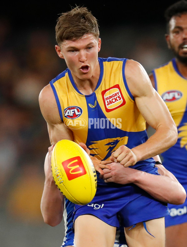 MELBOURNE, AUSTRALIA - MARCH 27: Brayden Ainsworth of the Eagles in action during the 2022 AFL Round 02 match between the North Melbourne Kangaroos and the West Coast Eagles at Marvel Stadium on March 27, 2022 In Melbourne, Australia. (Photo by Michael WillsonAFL Photos)