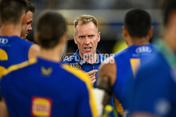 PERTH, AUSTRALIA - APRIL 15: Matthew Knights, Midfield Coach of the Eagles addresses their players at quarter time during the 2022 AFL Round 05 match between the West Coast Eagles and the Sydney Swans at Optus Stadium on April 15, 2022 In Perth, Australia. (Photo by Daniel Carson/AFL Photos)