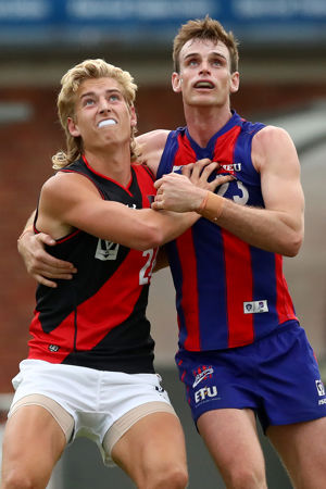 MELBOURNE, AUSTRALIA - APRIL 17: Nick Bryan of Essendon and Paul Hunter of Port Melbourne compete for the ball during the round four VFL match between Port Melbourne and the Essendon Bombers at ETU Stadium on April 17, 2022 in Melbourne, Australia. (Photo by Kelly Defina/AFL Photos)