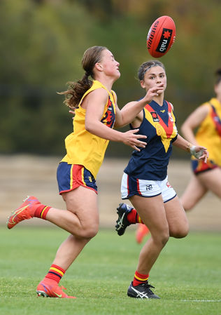 ADELAIDE, AUSTRALIA - JUNE 05: Jemma Whitington-Charity of SA Yellow competes with Tiah Hough of SA Blue during the AFLW U17 Girls Championships match between SA Yellow and SA Blue at Thebarton Oval on June 05, 2021 in Adelaide, Australia. (Photo by Mark Brake/AFL Photos)