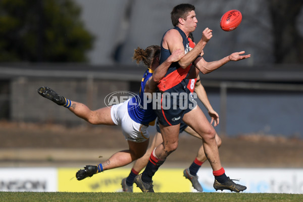 MELBOURNE, AUSTRALIA - AUGUST 01: Nathan Mullenger-McHugh of Coburg handballs during the round 16 VFL match between Coburg and Williamstown at Piranha Park on August 01, 2021 in Melbourne, Australia. (Photo by Morgan Hancock/AFL Photos)