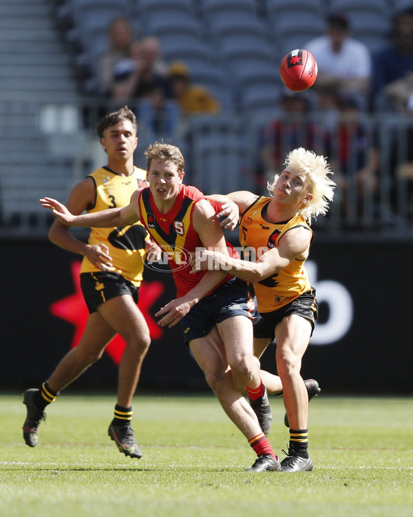 PERTH, AUSTRALIA - SEPTEMBER 25: Max Litster of South Australia and Kaden Harbour of Western Australia compete for the ball during the 2021 U19 Championship match between Western Australia and South Australia at Optus Stadium on September 25, 2021 in Perth, Australia. (Photo by Dylan Burns/AFL Photos)