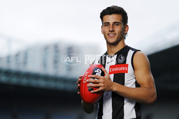 MELBOURNE, AUSTRALIA - NOVEMBER 25: Nicholas Daicos of the Magpies poses for a photo during the NAB AFL Draft Media Opportunity at Marvel Stadium on November 25, 2021 in Melbourne, Australia. (Photo by Dylan Burns/AFL Photos)
