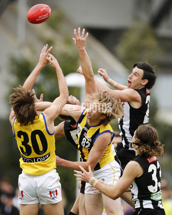 MELBOURNE, AUSTRALIA - JULY 04: Matthew Allison of the Dragons, Daniel Frampton of the Dragons, Liam Mcmahon of the Magpies and Jack Ginnivan of the Magpies compete for the ball during the 2021 VFL Round 12 match between the Collingwood Magpies and the Sandringham Dragons at the Holden Centre on July 4, 2021 in Melbourne, Australia. (Photo by Dylan Burns/AFL Photos)