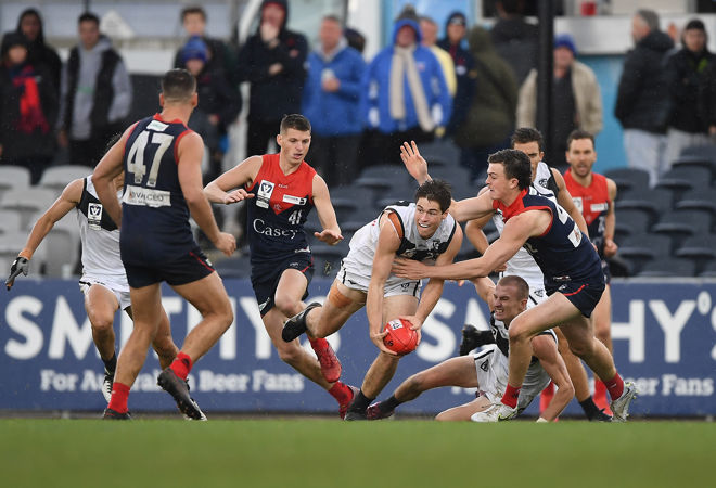 MELBOURNE, AUSTRALIA - SEPTEMBER 18: Daniel Charlesworth of the Southport Sharks in action during the 2022 VFL Grand Final match between the Casey Demons and the Southport Sharks at Ikon Park on September 18, 2022 in Melbourne, Australia. (Photo by Felicity Elliott/AFL Photos)