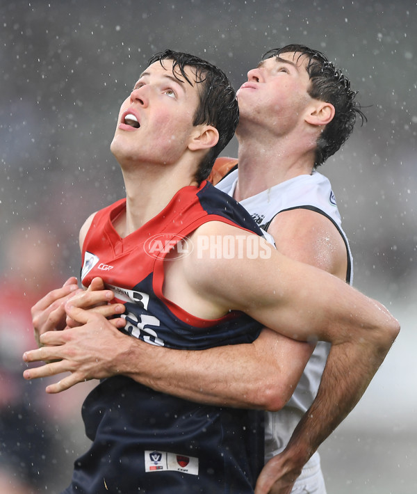 MELBOURNE, AUSTRALIA - SEPTEMBER 18: Ryan Valentine of the Casey Demons and Daniel Charlesworth of the Southport Sharks compete in a ruck contest during the 2022 VFL Grand Final match between the Casey Demons and the Southport Sharks at Ikon Park on September 18, 2022 in Melbourne, Australia. (Photo by Felicity Elliott/AFL Photos)