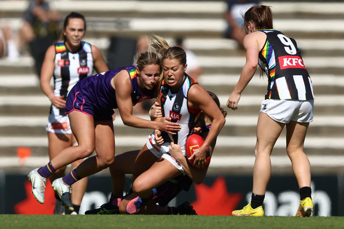 PERTH, AUSTRALIA - OCTOBER 16: Sarah Rowe of the Magpies gets tackled by Nikki Gore of the Dockers during the round eight AFLW match between the Fremantle Dockers and the Collingwood Magpies at Fremantle Oval on October 16, 2022 in Perth, Australia. (Photo by Paul Kane/Getty Images via AFL Photos)