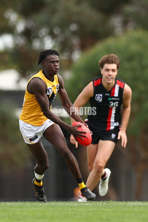 MELBOURNE, AUSTRALIA - MARCH 04: Emmanuel Ajang of Werribee (L) in action during the VFL Practice Match between Frankston and Werribee at Highgate Reserve on March 04, 2023 in Melbourne, Australia. (Photo by Graham Denholm/AFL Photos)