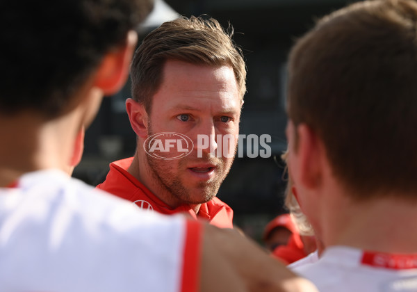 MELBOURNE, AUSTRALIA - AUGUST 27: Jeremy Laidler the coach of the Swans talks to his players during the VFL Qualifying Final match between Casey Demons and Sydney Swans at Casey Fields on August 27, 2022 in Melbourne, Australia. (Photo by Quinn Rooney/AFL Photos)