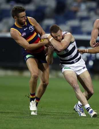 Brodie Smith of the Adelaide Crows tackles Sam Blease of the Geelong Cats during the 2015 NAB Challenge Week 3 match between the Geelong Cats and the Adelaide Crows at Simonds Stadium, Geelong on March 12, 2015. (Photo: David Callow/AFL Media)