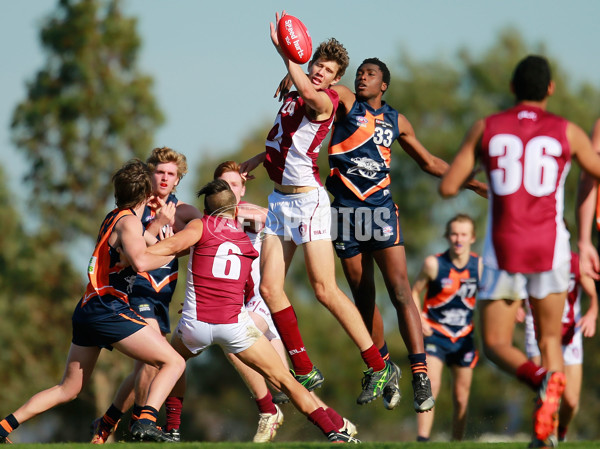MELBOURNE, AUSTRALIA - JUNE 13: Ovie Magbegor of the Cannons and Nate Dennis of Queensland compete for the ball during the round 10 TAC Cup match between the Calder Cannons and Queensland at RAMS Arena on June 13, 2015 in Melbourne, Australia. (Photo by Scott Barbour/AFL Media)