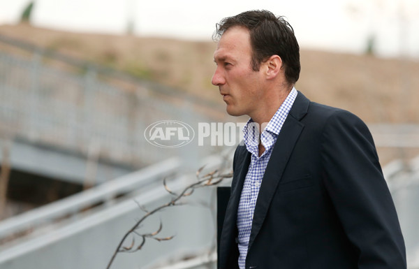 MELBOURNE, AUSTRALIA - AUGUST 18: Steven Alessio looks on after James Hird parted ways with the club during an Essendon Bombers press conference at the True Value Solar Centre, Melbourne on August 18, 2015. (Photo: Michael Willson/AFL Media)