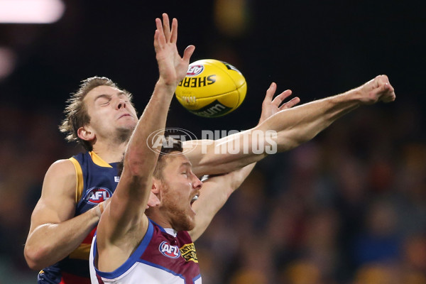 ADELAIDE, AUSTRALIA - AUGUST 22: Luke McGuane of the Lions pressured by Sam Shaw of the Crows during the 2015 AFL round 21 match between the Adelaide Crows and the Brisbane Lions at Adelaide Oval, Adelaide, Australia on August 22, 2015. (Photo by AFL Media)