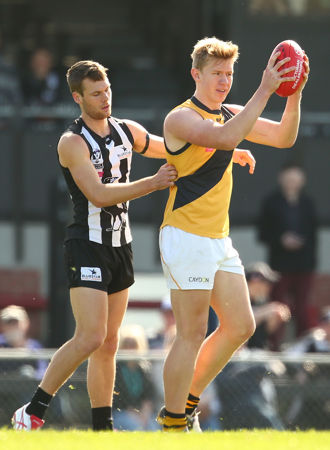 MELBOURNE, AUSTRALIA - AUGUST 22: Reece McKenzie of Richmond runs with the ball during the round 19 VFL match between Collingwood and Richmond at Victoria Park on August 22, 2015 in Melbourne, Australia. (Photo by Scott Barbour/AFL Media/Getty Images)