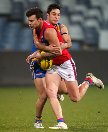 Rohan Kerr of the Falcons is tackled by Michael Gibbons of the Seagulls during the 2014 Foxtel Cup Grand Final match between the Williamstown Seagulls and the West Perth Falcons at Simonds Stadium, Geelong on July 22, 2014. (Photo: Michael Willson/AFL Media)