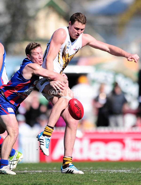 Luke Lowden of Box Hill gets a kick away before being tackled by Shane Valenti of Port Melbourne during the VFL 1st Qualifying Final match between Port Melbourne and Box Hill Hawks at North Port Oval in Melbourne on August 30, 2014. (Photo: Theo Karanikos/AFL Media)