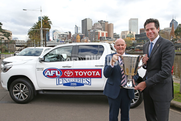 MELBOURNE, AUSTRALIA - AUGUST 31: Gillon McLachlan, Chief Executive Officer of the Australian Football League and Dave Buttner, President of Toyota Motor Corporation Australia pose with the AFL 2016 Premiership Cup during the Toyota AFL Finals Launch at the Richmond Rowing Club on August 31, 2016 in Melbourne, Australia. (Photo by Scott Barbour/AFL Media)