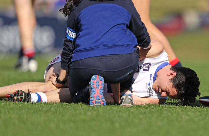MELBOURNE, AUSTRALIA - SEPTEMBER 3: Mark Austin of Footscray leaves the field injured during the VFL 1st Qualifying Final match between Casey Scorpions and Footscray at Casey Fields on September 3, 2016 in Melbourne, Australia. (Photo by Scott Barbour/AFL Media)
