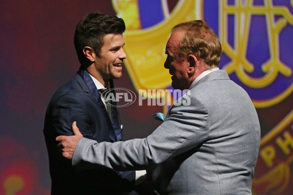MELBOURNE, AUSTRALIA - DECEMBER 13: Trent Cotchin of the Richmond Tigers is presented his Brownlow Medal by Tigers legend Ian Stewart during the 2012 Brownlow Medal presentation on December 13, 2016 in Melbourne, Australia. (Photo by Michael Dodge/Getty Images/AFL Media)