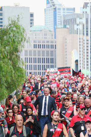 MELBOURNE, AUSTRALIA - MARCH 25: Bombers Paul Salmon and fans join the Walk To The MCG during the round one AFL match between the Essendon Bombers and the Hawthorn Hawks at Melbourne Cricket Ground on March 25, 2017 in Melbourne, Australia. (Photo by Michael Dodge/Getty Images)