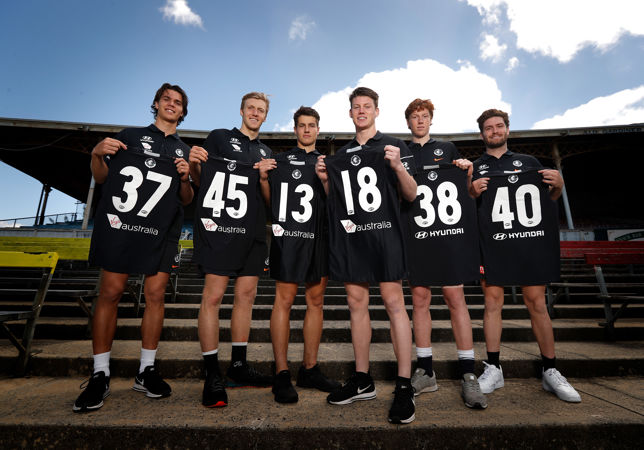 MELBOURNE, AUSTRALIA - NOVEMBER 26: New Blues recruits (L-R) Ben Silvagni, Hugh Goddard, Liam Stocker, Sam Walsh, Finbar O'Dwyer and Tomas Bugg pose with their new jumper numbers during the Carlton Blues training session at Ikon Park on November 26, 2018 in Melbourne, Australia. (Photo by Michael Willson/AFL Media)
