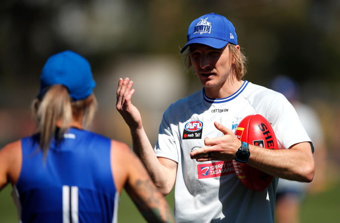 MELBOURNE, AUSTRALIA - DECEMBER 1: Dennis Armfield, Assistant Coach of the Kangaroos addresses players during a North Melbourne Kangaroos women's team open training session at Arden St Oval on December 1, 2018 in Melbourne, Australia. (Photo by Adam Trafford/AFL Media)