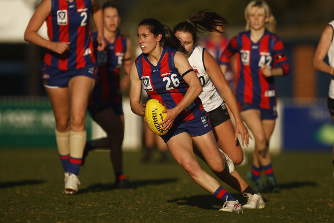 MELBOURNE, AUSTRALIA - APRIL 30: Jessie Williams of Port Melbourne looks to pass the ball during the round six VFL match between Port Melbourne and Carlton at ETU Stadium on April 30, 2023 in Melbourne, Australia. (Photo by Daniel Pockett/AFL Photos)