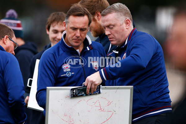 MELBOURNE, AUSTRALIA - JULY 08: Dragons head coach Jeremy Barnard (L) and Dragons talent manager Ryan O'Connor (R) discuss tactics during the round 12 TAC Cup match between Gippsland and Sandringham at Casey Fields on July 8, 2017 in Melbourne, Australia. (Photo by Daniel Pockett/AFL Media)