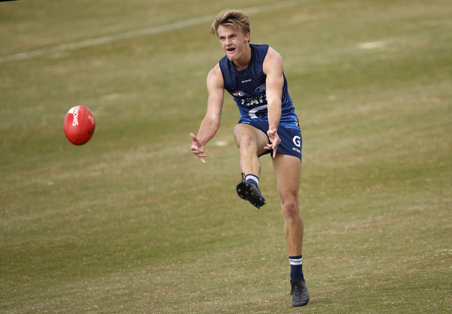 GEELONG, AUSTRALIA - NOVEMBER 19: Jacob Kennerley of the Cats kicks the ball during the Geelong Cats training session at Deakin University on November 19, 2019 in Geelong, Australia. (Photo by Dylan Burns/AFL Photos)