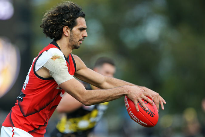 MELBOURNE, AUSTRALIA - MAY 25: Jake Long of Essendon runs with the ball during the round eight VFL match between Richmond and Essendon at the Swinburne Centre on May 25, 2019 in Melbourne, Australia. (Photo by Martin Keep/AFL Photos)