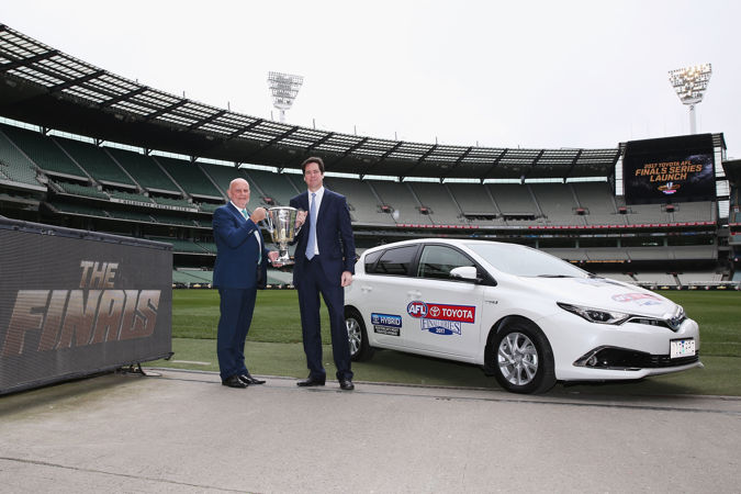 MELBOURNE, AUSTRALIA - SEPTEMBER 04: Toyita President Dave Buttner (L) and AFL CEO Gillon McLachlan pose with the AFL Premiership Cup during the 2017 AFL Finals Launch at Melbourne Cricket Ground on September 4, 2017 in Melbourne, Australia. (Photo by Michael Dodge/Getty Images/AFL Media)