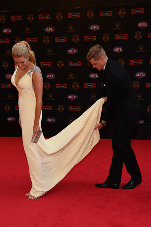 MELBOURNE, AUSTRALIA - SEPTEMBER 25: Nick Riewoldt and wife Catherine Riewoldt arrive ahead of the 2017 Brownlow Medal at Crown Entertainment Complex on September 25, 2017 in Melbourne, Australia. (Photo by Quinn Rooney/Getty Images/AFL Media)