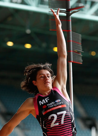 MELBOURNE, AUSTRALIA - OCTOBER 05: Matthew McGannon performs a vertical jump during the AFL Draft Combine at Etihad Stadium on October 5, 2017 in Melbourne, Australia. (Photo by Adam Trafford/AFL Media)