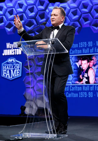 MELBOURNE, AUSTRALIA - MAY 29: Wayne Johnson addresses the room as he is inducted during the 2018 Australian Football Hall of Fame Dinner at the Crown Palladium on May 29, 2018 in Melbourne, Australia. (Photo by Adam Trafford/AFL Media)