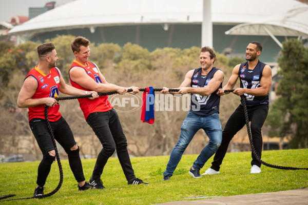ADELAIDE, AUSTRALIA - AUGUST 30: L-R Sam Fisher, Nathan Bock, Campbell Brown and Josh Gibson have a tug of war during the EJ Whitten Legends Game Media Opportunity at Adelaide Oval, Adelaide, Australia. (Photo by James Elsby/AFL Media)
