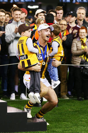 MELBOURNE, AUSTRALIA - SEPTEMBER 23: Brendan Whitecross of the Box Hilll Hawks and his kids celebrate the win during the VFL Grand Final match between Casey and Box Hill at Etihad Stadium on September 23, 2018 in Melbourne, Australia. (Photo by Michael Dodge/AFL Media)