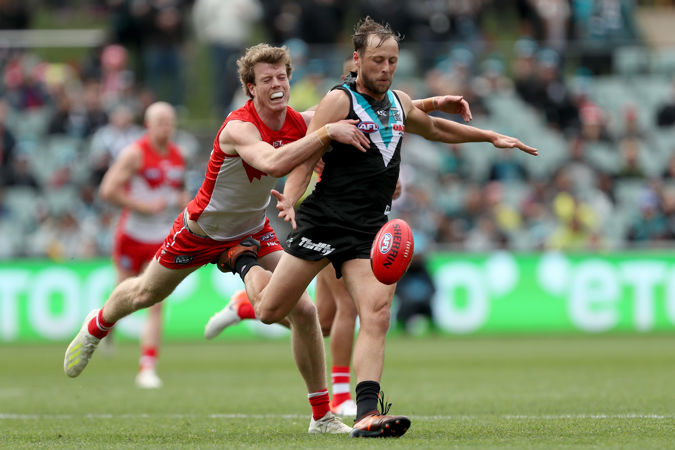 ADELAIDE, AUSTRALIA - AUGUST 10: Cameron Sutcliffe of the Power is tackled by Nick Blakey of the Swans during the 2019 AFL round 21 match between the Port Adelaide Power and the Sydney Swans at Adelaide Oval on August 10, 2019 in Adelaide, Australia. (Photo by James Elsby/AFL Photos)