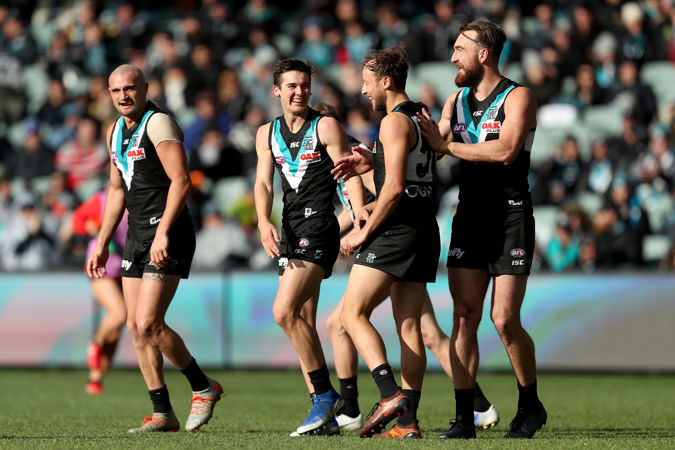 ADELAIDE, AUSTRALIA - AUGUST 10: Cameron Sutcliffe of the Power celebrates a goal during the 2019 AFL round 21 match between the Port Adelaide Power and the Sydney Swans at Adelaide Oval on August 10, 2019 in Adelaide, Australia. (Photo by James Elsby/AFL Photos)