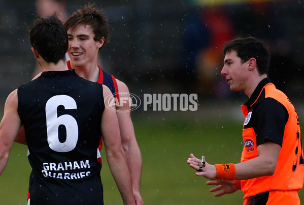 Steven Verrier of the Tigers and Jayden Cass of the Dolphins jostle during the 2013 VFL Round 13 match between Frankston and Coburg at Frankston Oval, Melbourne on July 7, 2013. (Photo: Darrian Traynor/AFL Media)