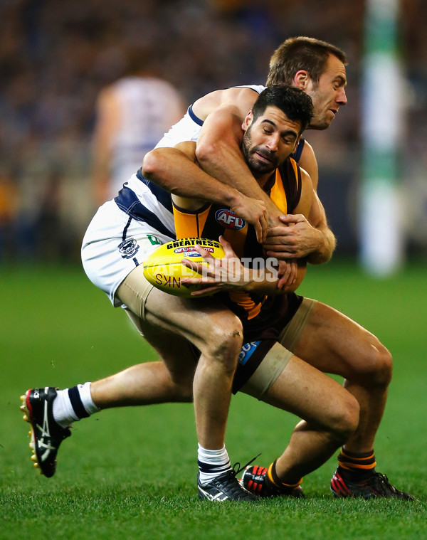 Joel Corey of the Cats tackles Paul Puopolo of the Hawks during the 2013 1st Preliminary Final match between the Hawthorn Hawks and the Geelong Cats at the MCG, Melbourne on September 20, 2013. (Photo: Andrew White/AFL Media)