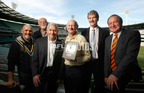(L-R) Dale Weightman, Toney Jewell, Tom Hafey, Kevin Bartlett, Barry Richardson and Kevin Sheedy pose for a photograph during the 'KB - A Life in Football' book launch at the Melbourne Cricket Ground.