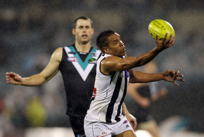Andrew Krakouer of the Magpies marks during the AFL Round 20 match between Port Adelaide Power and the Collingwood Magpies at AAMI Stadium, Adelaide.