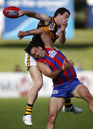 Cory McGrath of Port Melbourne and James Saker of Werribee contest the ball during the VFL Round 10 match between Port Melbourne and Werribee at TEAC Oval, Melbourne.